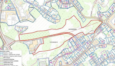 Vilnius, Lithuania. Uzupis Jewish cemetery. Olandu street is on the left you can see how the "new" road cuts through the cemetery (view below). The red lines indicates the cemetery limit - I cannot say for sure that this corresponds exactly the historic boundary. Map from "Special Plan of Pavilniai Regional Park," courtesy Vilnius Municipality