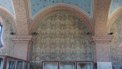 The walls are covered with a repeating vegetable and floral pattern in an Art Nouveau style that recalls textile patterns of the time. compare this with the stenciled pattern on the wall of the synagogue at St. Polten, Austria, about which I've previously written.