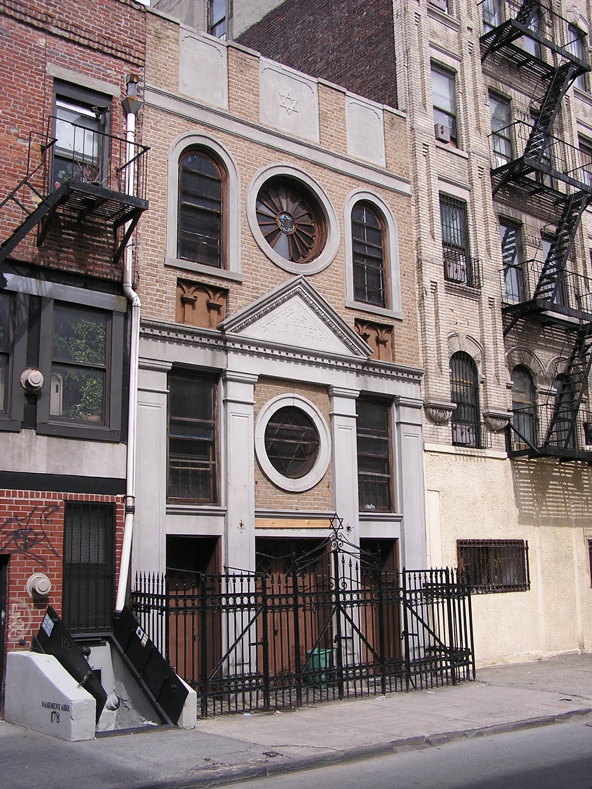 Even before the sanctuary was built the congregation erected an adjacent school, activities and office building that still serves these functions. It was normal for synagogue centers at the time to be built in phases - and remains so today. I can think of several instances where congregations built their school buildings first with flexible space to be used for worship as well, and then never went to build their planned sanctuaries. The best known instance of this is Union Temple in Brooklyn. Ohabei Shalom's school wing is now as often reached by car as by public transport or on foot, so an ample parking lot is in the rear, and a new modern style entrance has been created in the back of the building - which now serves as the de facto front.