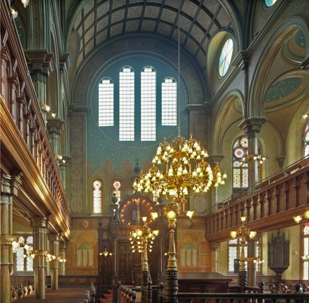 In the end the Ohabei Shalom tower was not built, which actually better emphasizes the geometrical integrity of the synagogue design. The dome drum windows were also changed, and it was until a recent renovation of the building that a towering menorah was installed, now atop the dome replacing an earlier simple Star of David. There is rich and intricate brick, carved stone and metalwork detailing throughout the building. My favorite element are the bronze shofars sculpted as door handles on the entrance doors.